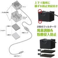市販のUSBバッテリー(DC5V/1A以上)をつなげれば、電源の無い場所でも使用できるので、移動中のキャリー内の換気にも使えます。 |
