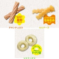 鶏肉類(鶏ガラ、鶏ササミ)、米粉、でん粉、アメリカミズアブ、チーズ、ニンジン、グリセリン、増粘安定剤(加工でん粉、グァーガム)、酸化防止剤(亜硫酸水素ナトリウム、ビタミンE)、炭酸カルシウム、リン酸カリウム