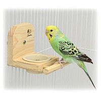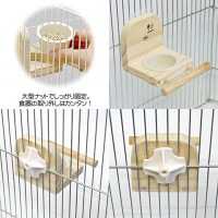 ケージにしっかり固定できる木製のホルダーに小さな食器乗せています。